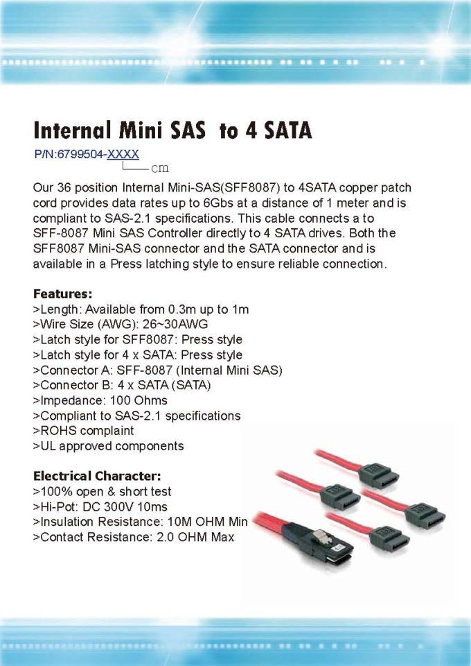 >Length: Available from 0.3m up to 1m >Wire Size (AWG): 26~30AWG >Latch style for SFF8087: Press style >Latch style for 4 x SATA: Press style >Connector A: SFF-8087 (Internal Mini SAS) >Connector B: 4 x SATA (SATA) >Impedance: 100 Ohms >Compliant to SAS-2.1 specifications >ROHS complaint >UL approved components |